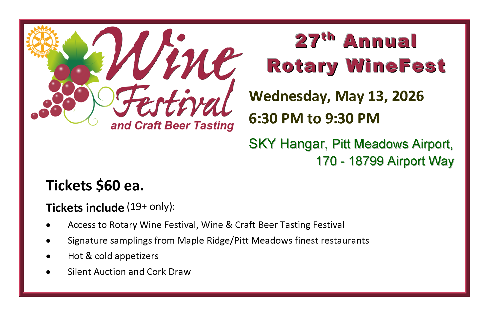 27th Annual Rotary Wine Festival on Wednesday May 13, 2026.